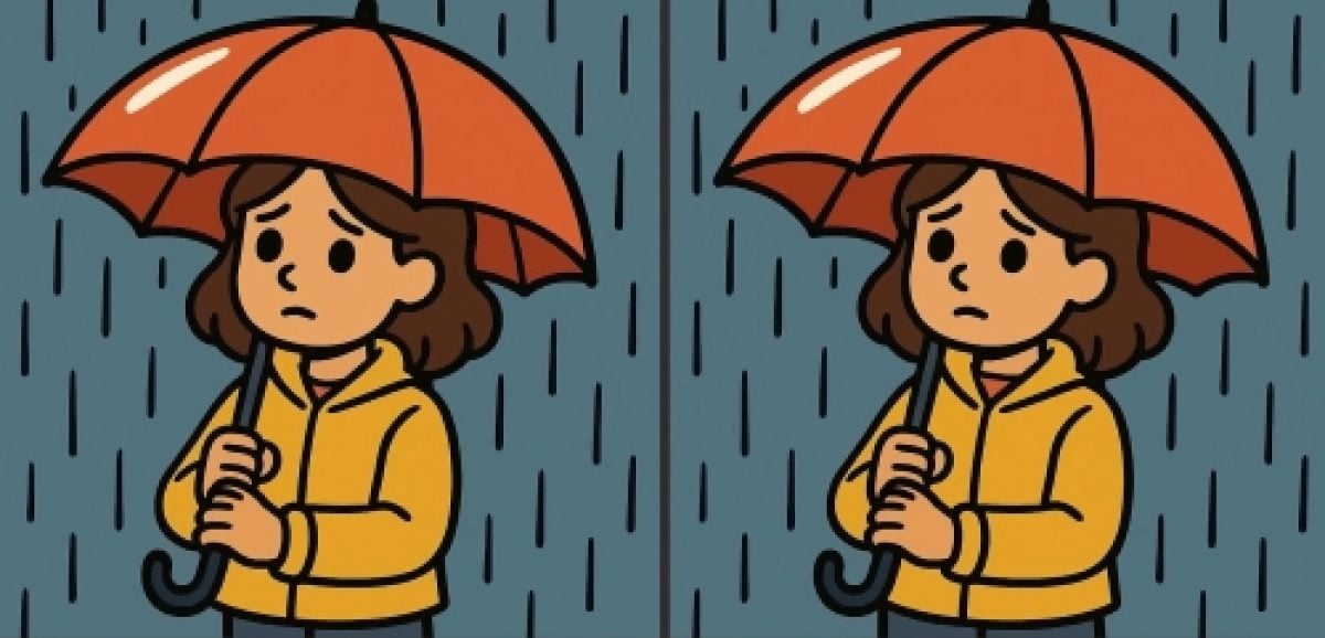 Er du klar for neste utfordring? Ta en nærmere titt på de to bildene av jenta i regnet. Ved første øyekast kan de se identiske ut, men hvis du ser nøye etter, vil du oppdage at det er tre forskjeller skjult i bildene. Kan du finne disse forskjellene på 23 sekunder? Start tidtakeren og test synsskarpheten din.