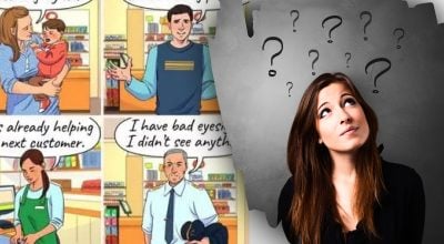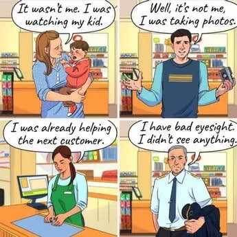 Alt du trenger å gjøre er å se på bildet nedenfor og identifisere hvem av personene i butikken som har stjålet noens lommebok. Tre av personene på bildet snakker sant, men én av dem lyver.