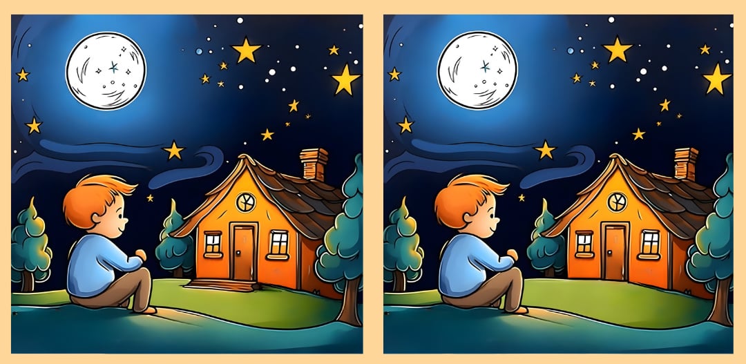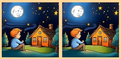 Er du klar for neste utfordring? Ta en nærmere titt på to bilder av en gutt som sitter alene med en stjerneklar natt som bakteppe. Ved første øyekast kan bildene se identiske ut, men hvis du ser nøye etter, vil du oppdage at det er tre forskjeller skjult i bildene. Kan du finne disse forskjellene på 19 sekunder? Start tidtakeren og test synsskarpheten din.