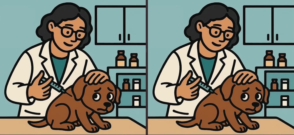 Er du klar for neste utfordring? Ta en nærmere titt på to bilder av en veterinær som gir en hund en sprøyte. Ved første øyekast kan bildene se like ut, men det er tre små forskjeller. Tror du at du kan finne dem alle på 63 sekunder? Prøv det og test synsskarpheten din!