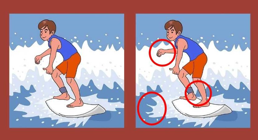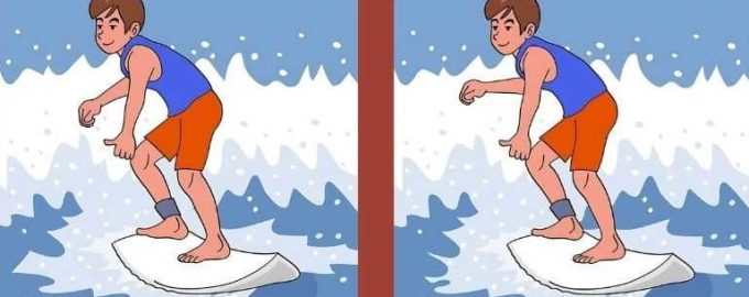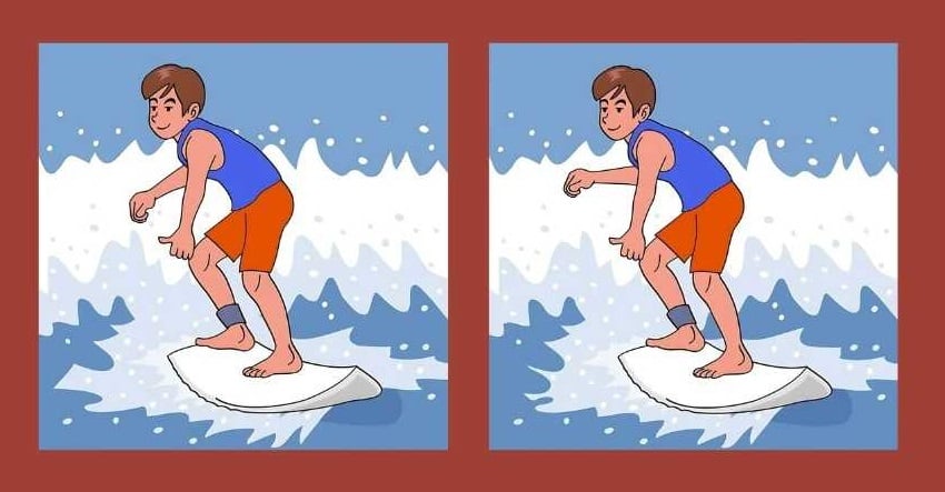 På bildet ser vi en surfer som erobrer bølgene på et surfebrett. Ved første øyekast kan det virke som om gutta på begge bildene er de samme, men hvis du ser nærmere etter, blir det klart at det ikke er det – et eller annet sted er det noen forskjeller som gjør bildene forskjellige.