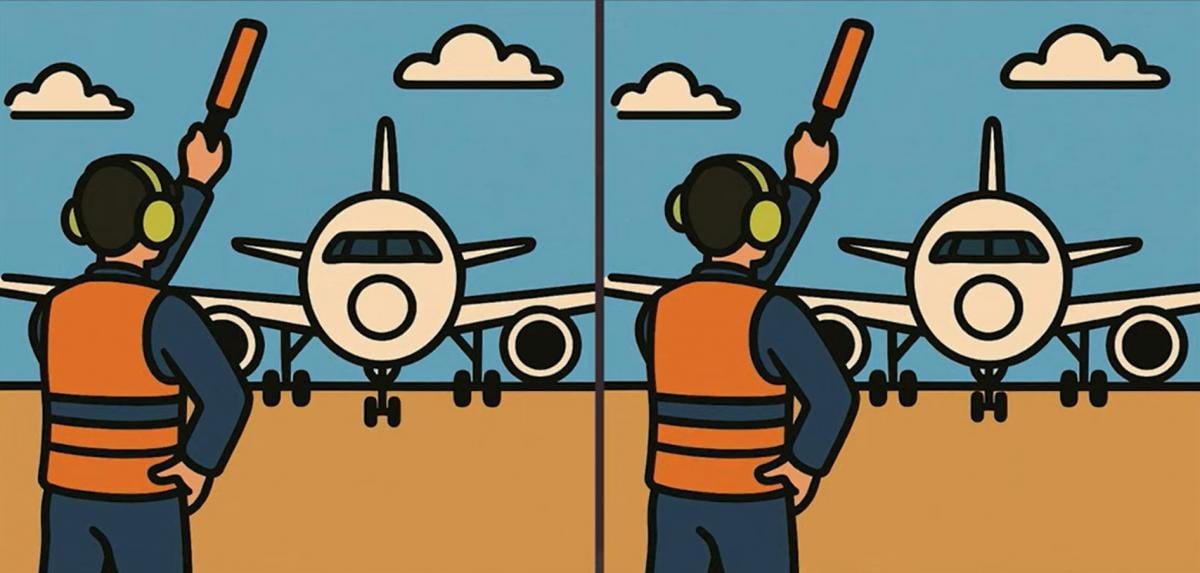 Er du klar for neste utfordring? Ta en nærmere titt på de to bildene av en flygeleder som styrer et fly. Ved første øyekast ser de kanskje like ut, men det er tre små forskjeller. Tror du at du kan finne dem alle på 45 sekunder? Prøv det og test synsskarpheten din!