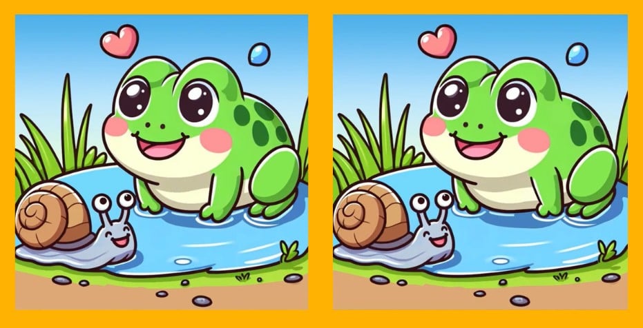 Er du klar for neste utfordring? Ta en nærmere titt på to bilder av en frosk og en snegl. De ser kanskje like ut ved første øyekast, men det er tre små forskjeller. Tror du at du kan finne dem alle på 17 sekunder? Prøv det og test synsskarpheten din!