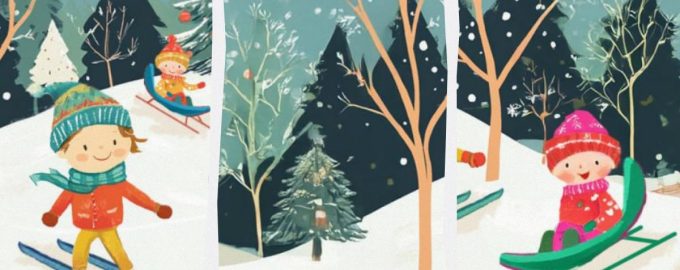 Foran deg ser du en gjeng glade barn som nyter snøen og det ekte vinterværet i skogen. De minste aker, mens de eldre vennene deres står på ski.